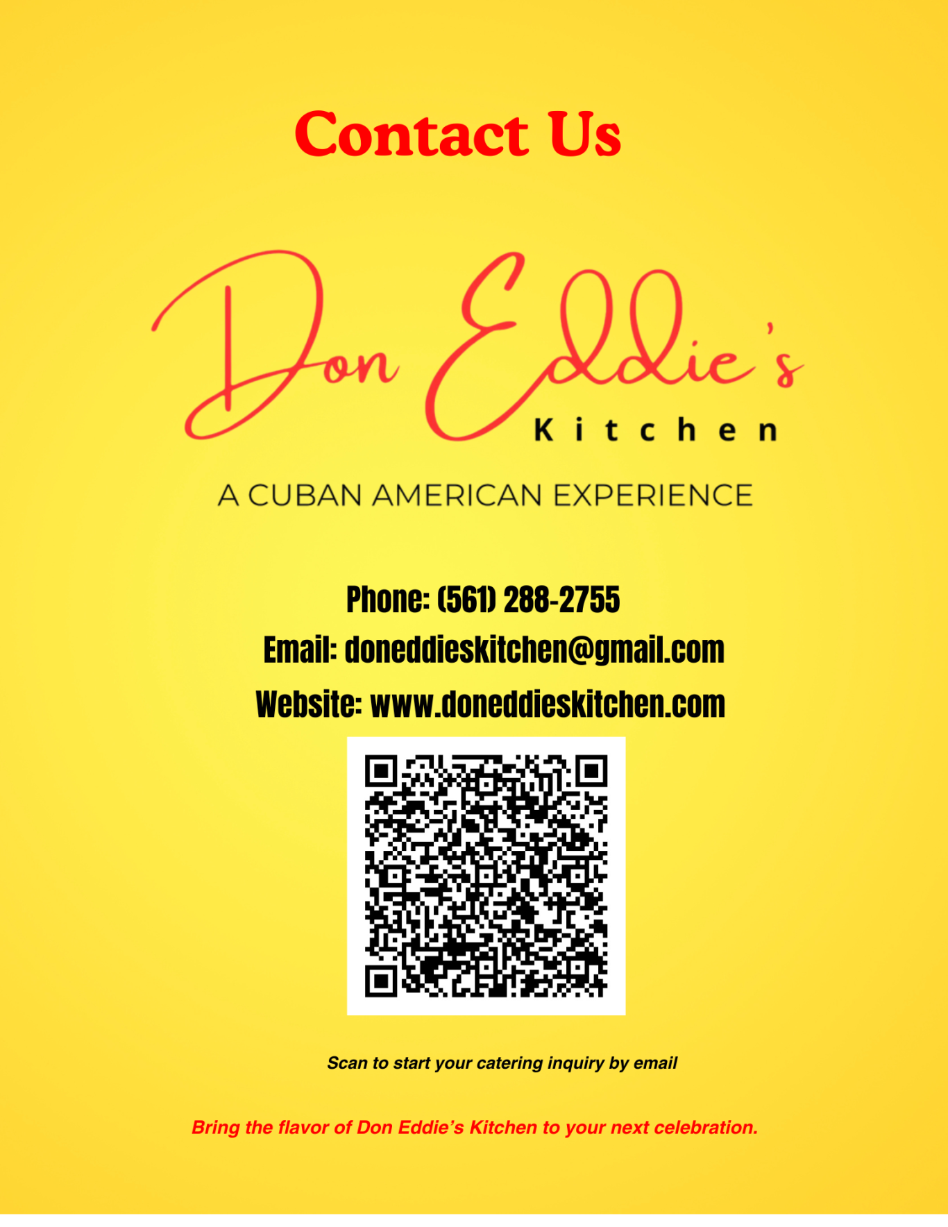 Welcome to Don Eddie's Kitchen! We’re Eddie and Ivonne, and we’re excited to share our fresh, made-from-scratch Cuban American dishes with you. From our 24-hour marinated and slow-roasted pork to our in-house cured and smoked ham, every bite is crafted with care. All of our sauces and condiments are handmade using only the finest ingredients. Buen provecho!