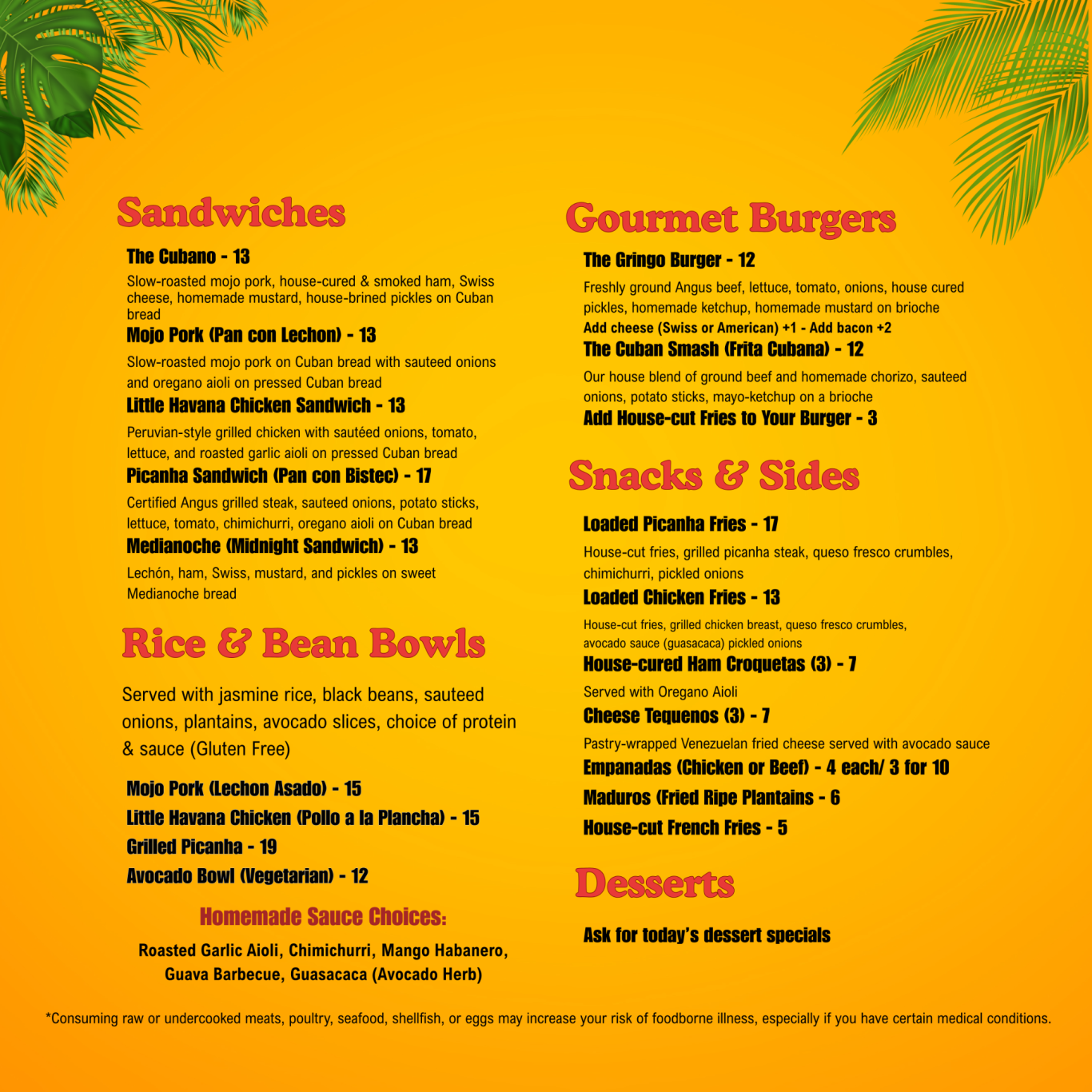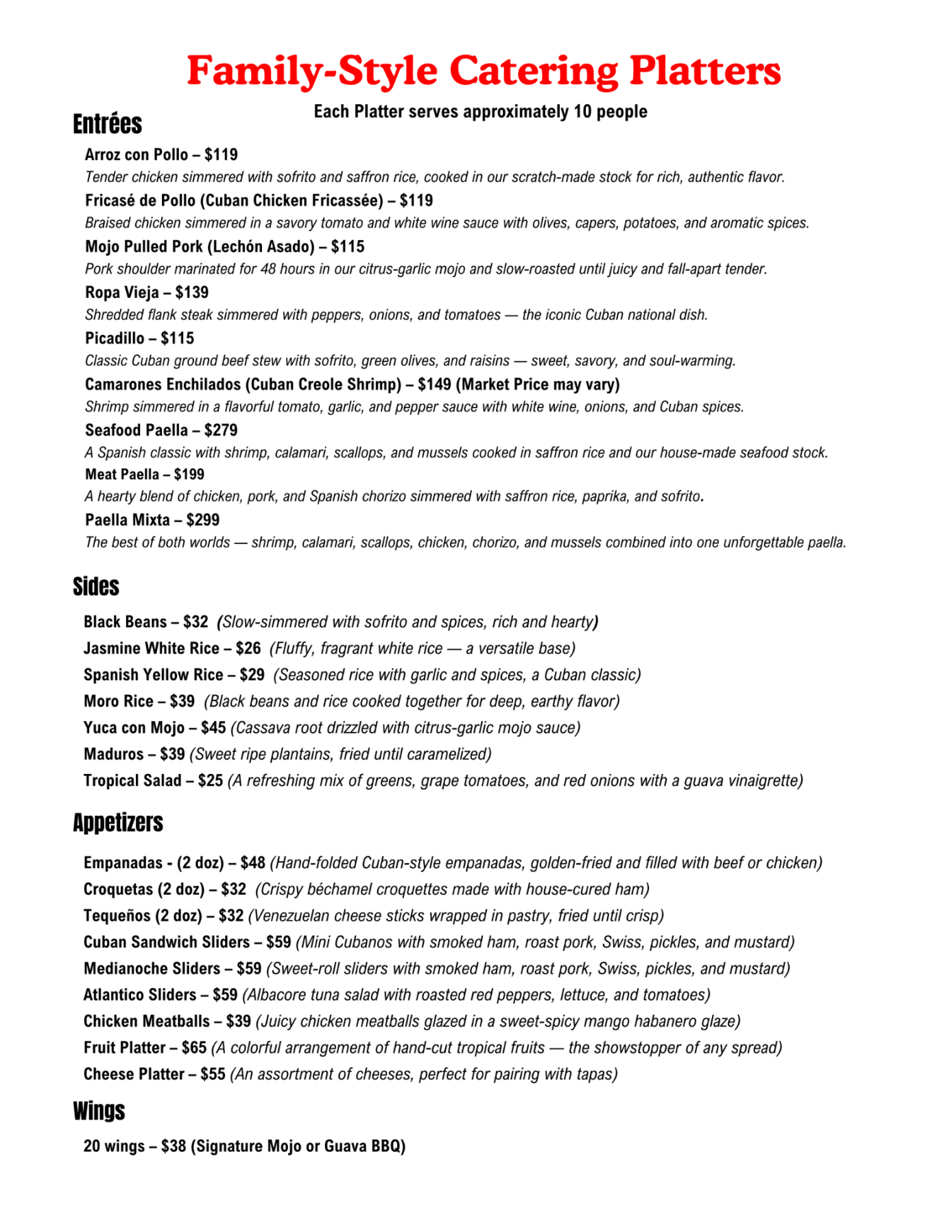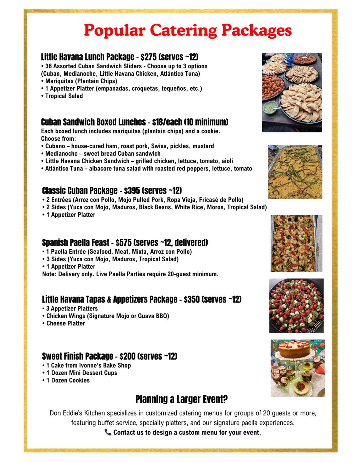Welcome to Don Eddie's Kitchen! We’re Eddie and Ivonne, and we’re excited to share our fresh, made-from-scratch Cuban American dishes with you. From our 24-hour marinated and slow-roasted pork to our in-house cured and smoked ham, every bite is crafted with care. All of our sauces and condiments are handmade using only the finest ingredients. Buen provecho!