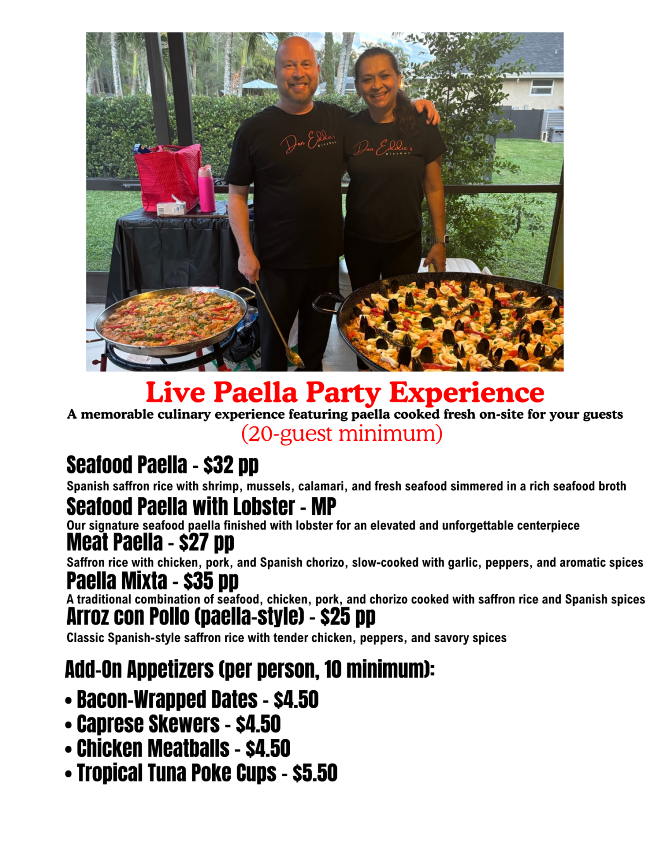 We offer delivery throughout Central and South Palm Beach County. Please place your order at least 48 hours in advance. A minimum delivery fee of 10% will be applied to all orders. The Paella Party covers all of Palm Beach, Broward, Miami-Dade Counties.